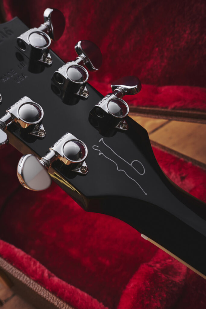 ステージ写真で見たときに「それだ」と分かるよう、ピックガードやジャックプレートまで黒×クロームで統一。ヘッド裏のアーティストサイン・レプリカは、実用よりもファンの満足度を最優先したディテールです。